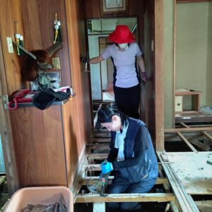 作業内容は床剥がしや泥出し、釘抜き清掃を行いました。はじめてのボランティア活動の方には慣れた方に教えていただき、想定よりもスムーズに作業が進みました。