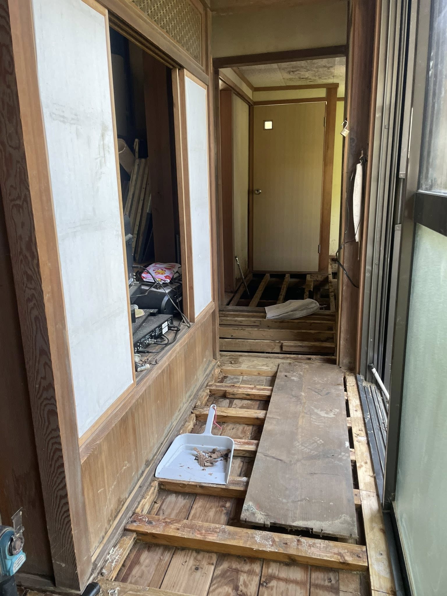 並行してまだ未着手だった部屋の床を剥がしながら、丁寧に養生したり、風呂場の掃除なども行いました。