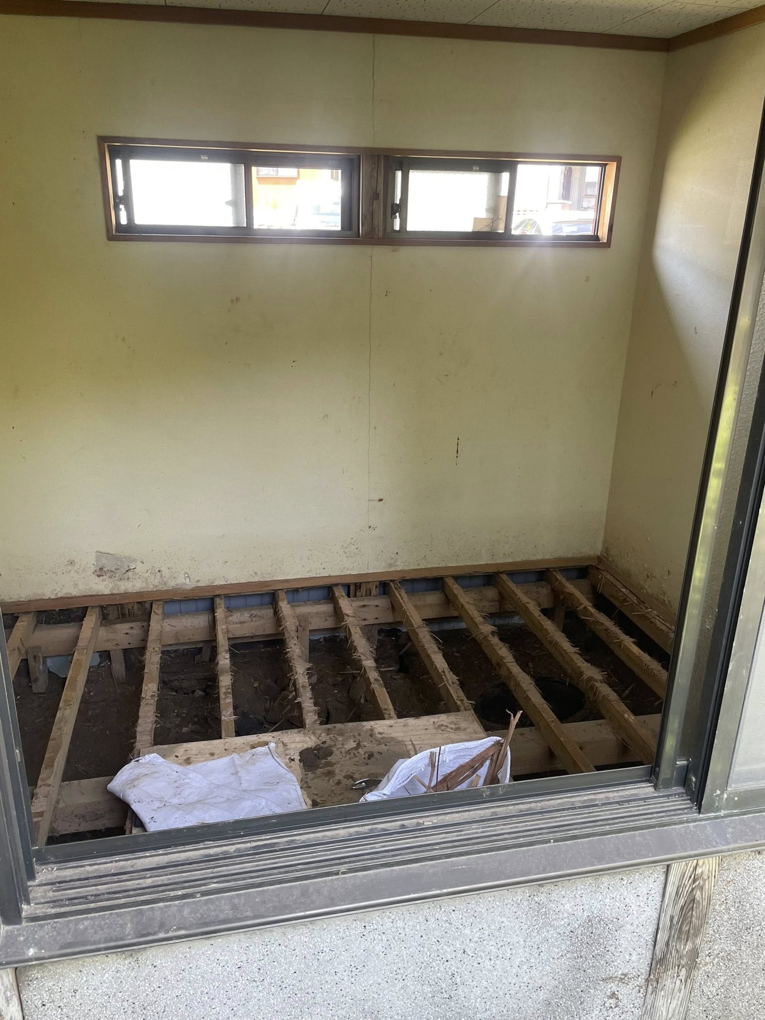 浸水した離れの部屋の荷物を一旦外に出して、床の掃除を行いました。